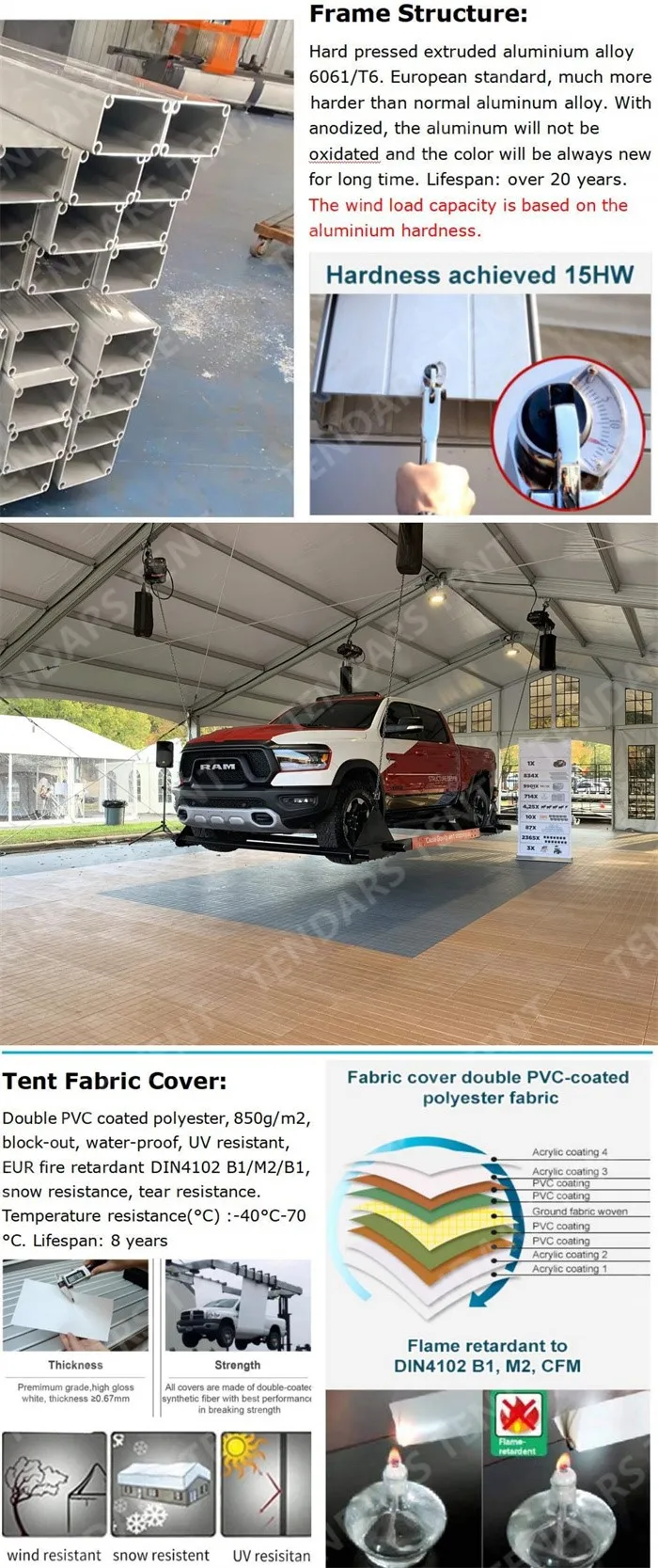 Materiale de calitate premium: Folosim structuri de aluminiu de înaltă calitate, combinate cu țesături din PVC de înaltă densitate pentru a ne asigura că corturile noastre rezistă climatelor dure, de la soarele înfiorătoare la zăpadă abundentă .